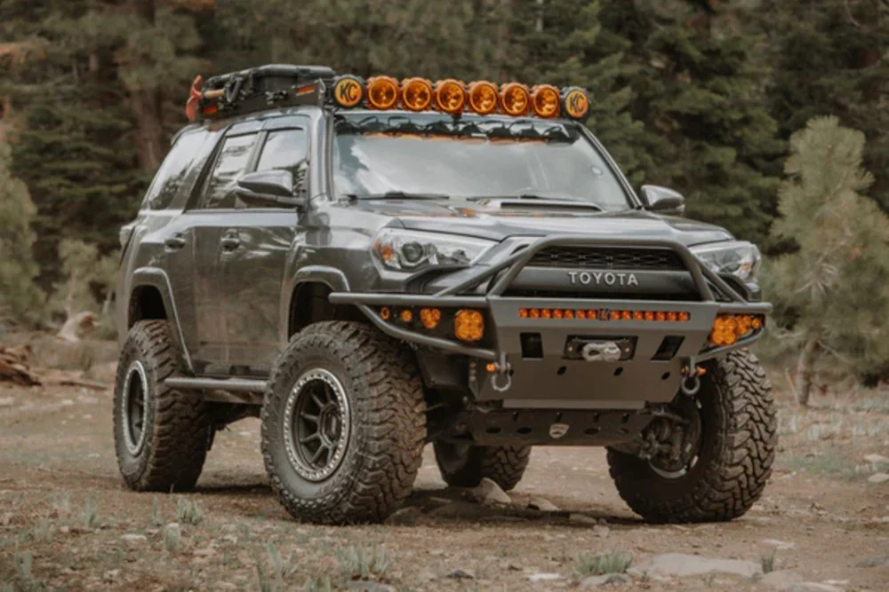 Transform your (2014-2024) Toyota 4Runner with the Hybrid Front Bumper from C4 Fabrication. This unique bumper combines a perfect blend of rugged durability and sleek design with its robust plate steel center and round tubing sides, providing a "lighter" look while accommodating a winch, LED light bar, and multiple fog lighting options. Designed for off-road enthusiasts, it offers superior clearance and approach angles, making it easier to fit larger tires.